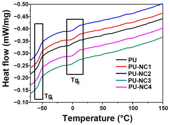 Another important aspect related to the performance of polyurea-based materials designed for ballistic protection is related to their glass transition temperature. At lower temperatures, but still above the value of the glass transition temperature, polyurea tends to pass into the glass phase due to the energy dissipation phenomenon generated during a deformation caused by the action of a shock wave or impact with a projectile [17,20,31]. As can be observed in Figure 6, the synthesized materials exhibited two glass transition temperatures, each of them corresponding to the flexible and rigid nanodomains of the polyurea nanocomposite, respectively. Table 4 summarizes the two Tg values obtained for the synthesized materials. It can be noticed that the values obtained for the glass transition temperatures associated with the flexible nanodomains (Tg1) were quite similar to the blank sample (PU) because there are no significant differences between the aliphatic chains situated at a considerable distance from the rigid nanodomains, but there is a visible difference between the Tg2 values obtained for the reference sample (PU) and the nanocomposite samples (PU-NC) because the carbon nanofiller joins the rigid nanodomains, thus reducing the mobility of the polymeric chains situated in their proximity.