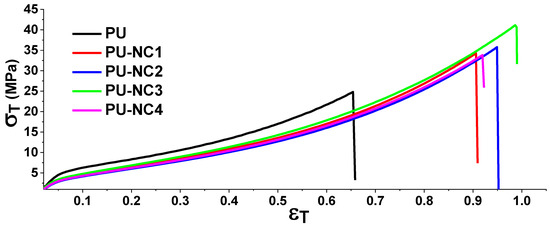 True stress–true strain plots for the synthesized polyurea-polyurethane nanocomposite films.