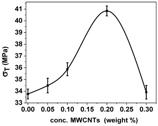 To obtain superior mechanical properties for a particular type of polymeric matrix, it is necessary to take into account the size, shape, and chemical properties of the nanometric filler particles [13]. Multiwall carbon nanotubes (MWCNTs) have been extensively used in nanocomposites due to their outstanding properties: high Young’s modulus, stiffness, flexibility, and conductivity. Additionally, only a 1% MWCNTs content can lead to an increase of up to 36–42% of the modulus of elasticity for composite material [14,15,16]. Even though carbon nanotubes have great potential as nanofillers, a major concern related to the performance of MWCNTs-based nanocomposites is represented by the difficulty of achieving their homogenous dispersion. The dispersability of carbon nanotubes in the polymer matrix is conditioned by their chemical and physical compatibility. Therefore, in some cases, the functionalization of MWCNTs can become mandatory for their compatibilization with the organic substrate.