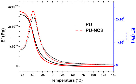 Both E′ and E″ were higher in the case of PU-NC3, showing that this nanocomposite possesses the ability to store a significant amount of energy, and it can also dissipate a higher quantity of energy in comparison with the neat polyurea (PU). The peaks corresponding to the loss modulus can allow the estimation of the glass transition temperature at around −50 °C, indicating that this value obtained through DMA technique is following DSC analysis.