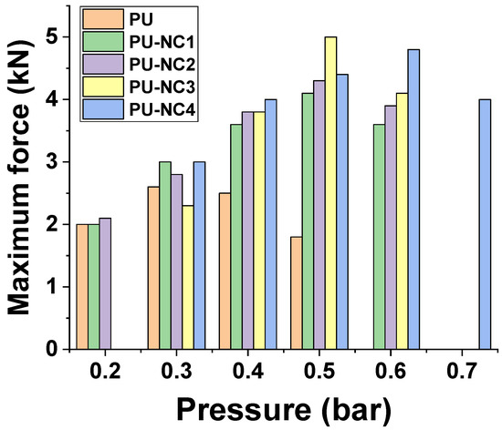 For the experimental testing in the dynamic regime, we used a Hopkinson bar set-up, with every sample being fixed and aligned for axial symmetry. An air gun, which allows the variation of pressure, launches the striker (the spherical head projectile in our case) towards the direction of the center of the tested specimen. Thus, the sample is rapidly impacted by the compressive stress wave generated. At impact, the samples undergo rapid and permanent deformations or fractures. Table 6 and Table 7 and Figure 10 display the results obtained with the Hopkinson bar tests. As can be noticed in Table 7, at an initial projectile acceleration pressure of 0.2 bars, all the samples underwent deformations, but none of them suffered fissures. Starting with 0.3 bars, small cracks appeared in the aluminum plate, but the samples covered with polyurea, even if they displayed higher deformations, did not suffer fractures, meaning that neat polyurea already offers significant improvement. At a higher initial projectile acceleration pressure of 0.4 bars, the aluminum plate underwent a higher fracture, but the polyurea-coated specimens did not exhibit fissures. Only at 0.5 bars of initial projectile acceleration pressure could a small fissure be observed on the aluminum plate coated with polyurea, but the polyurea film remained unbroken due to its higher elasticity, and the specimens coated with the nanocomposite suffered only low deformations and no fractures. At a higher initial projectile acceleration pressure of 0.6 bars, polyurea films PU and the nanocomposite containing the lowest MWNCTs concentration PU-NC2 started to crack. At 0.6 bars, the aluminum plate coated with PU-NC3 suffered low fractures, but this polymeric film resisted up to 0.8 bars. Therefore, we can affirm that, only at values higher than 0.8 bars for the initial projectile acceleration pressure, did both layers (metallic layer and polymeric nanocomposite coating) undergo visible fractures; at lower values, the metallic layer was the only one that cracked. In the case of PU-NC4 specimens, the metallic layer exhibited low fissures at 0.7 bars, and both layers (metallic plate and polymeric nanocomposite coating) were fractured at values higher than 0.8 bars. The increase in the resistance of the aluminum plates covered with PU and PU-NC can also be highlighted by the recordings made with the help of the pressure transducer (Table 6). From the values displayed in Table 6, it can be noticed that, for the tests performed on the uncoated metallic plates, the maximum value of the force was 2.6 kN at the pressure of 0.3 bar. This characteristic displayed a decreasing trend for the tests performed at higher pressures, and could be associated with the loss of the integrity of the plate (fracturing phenomenon). On the other hand, for the specimens coated with polyurea, the values measured with the pressure transducer were almost double for the maximum force, more precisely 5 kN for PU-NC2 at 0.5 bars. For higher initial projectile acceleration pressure, all specimens, including the ones coated with the nanocomposite, followed the same trend: after reaching a maximum value of the force, there was a decrease, a phenomenon associated with the loss of the integrity of the metal plates.
