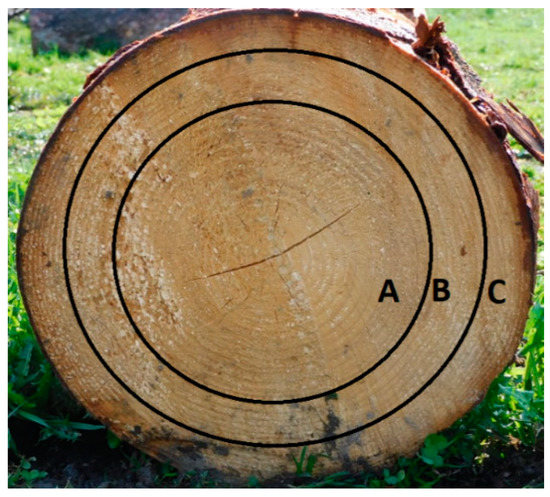 Norway spruce wood (Picea abies L. Karst.) was harvested in the middle part of Slovakia (Zvolen region) in June. The 65-year-old tree was cut 0.5 m from the ground and its height was 25 m. For the experiment, we used a 5 m long trunk part (the diameter of 32 cm—thicker part and the diameter of 29.5 cm—thinner part) and the top part of tree, represented the waste biomass (the diameter of 12 cm—thicker part and the diameter of 7.5 cm—thinner part). We took samples (cut with an all diameter) from the trunk in a height of 0.5, 1.5, 2.5, 3.5 and 4.5 m from the ground and both wood and bark from the top. Equally, we took samples A, B, C (Figure 1) in a height of 0.5 and 4.5 m, whereas sample A represent juvenile wood, which is within the first 20 years of growth; B sample, the next 20 years; and C sample, the rest.