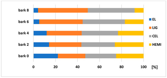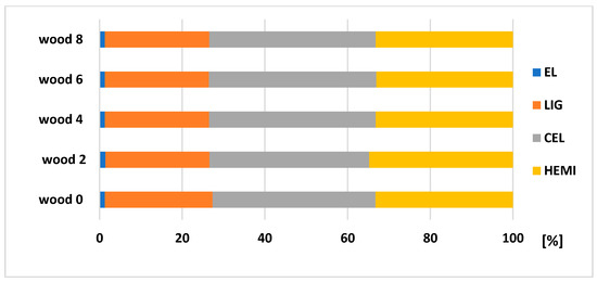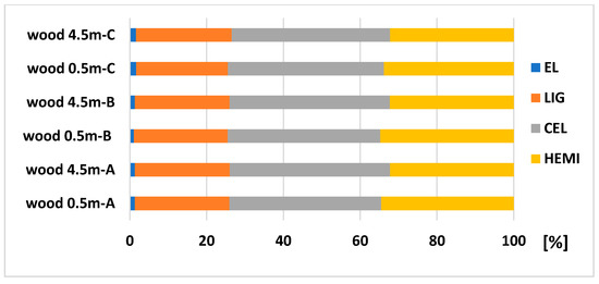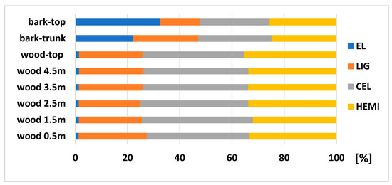 The amount of main chemical compounds: LIG (from 23.69 to 26.06%), CEL (from 39.01 to 42.51%), and HEMI (from 34.98 to 35.30%) were very similar in wood samples taken from the trunk (in a height from 0.5 to 4.5 m) compared to the top part. Sjostrom [27] mentions the lignin content of 27.5%, cellulose of 39.5 and hemicelluloses of 17.2% for Picea glauca; Wang et al. [28] showed a Klasson lignin of 28.2% for Picea abies (L.) H. Karst; Neiva et al. [29] showed a lignin content of 27.22%, polysaccharides of 71.18% for Picea abies (L.) H. Karst; Harris [30] showed a lignin from 28.0% to 30.8%, cellulose content from 38.1% to 40.3% for juvenile wood, and the lignin from 26.1% to 28.2%, cellulose from 40.2% to 42.7% for the mature wood of Norway spruce.