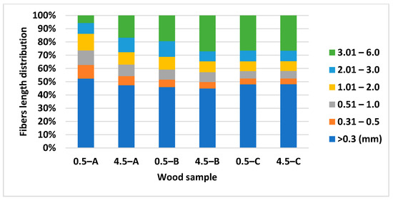 Fibers length distribution of spruce wood trunk at heights of 0.5 and 4.5 m. Fibres length classes: >0.3; 0.31–0.5; 0.51–1.0; 1.01–2.0; 2.01–3.0; 3.01–6 mm.