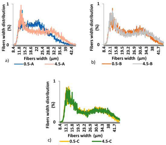 Fibers width distribution of spruce wood trunk at heights of 0.5 and 4.5 m; (a) samples 0.5-A, 4.5-A; (b) samples 0.5-B, 4.5-B; (c) samples 0.5-C, 4.5-C.
