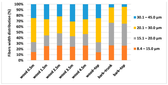 Fibres width distribution of spruce wood and bark at different heights. Fibres width classes: 8.4–15.0 µm; 15.1–20.0 µm; 20.1–30.0 µm; 30.1–45.0 µm.