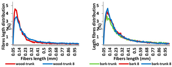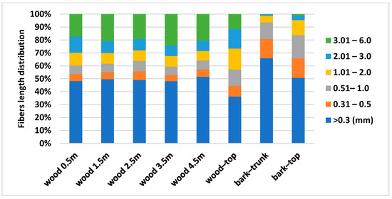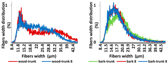 The results of the bark analysis (Figure 6 and Figure 7) show the differences mainly in fibre length distribution. The results of fibers width distribution were very similar and the largest proportion of fibers is in the class from 15.1 to 30 µm (67.53–69.17%). Bark from the trunk contains a high amount of fines (65.9%) and a lower amount of longer fibers compared to the bark from the top part of the tree. Bark contains a higher amount of shorter fibers to 0.5 mm (65.88% bark-top, 80.81% bark-trunk), than the wood part.
