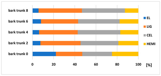 The analysis of chemical composition of wood and bark in different heights (Figure 3) exposed that the extractive content of both wood and bark is growing up with a height of the tree. The biggest extractives content of 32.35% was recorded in bark taken from the top part. Several authors mention the extractives amount of spruce bark from 23.5% to 28.3%, depending on the part of bark (inner bark from 17.3 to 38.7%, outer from 19.1 to 43.3%) [20,21,22,23]. The extractives content of the wood part is between 1% and 4.5% [24,25], while there is a difference between sapwood, values from 1.7% to 2.7% and heartwood, from 1.1% to 1.8% [26].