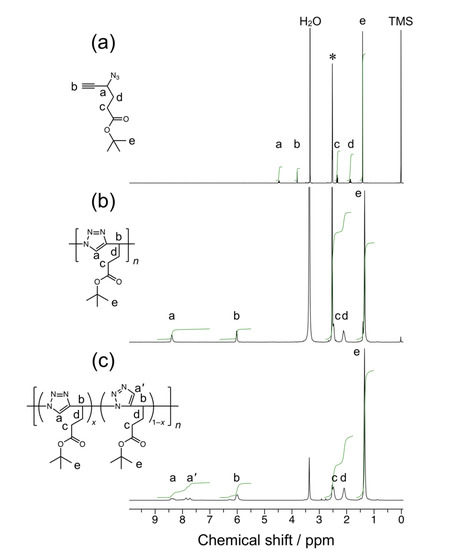 After some trials, we have designed a 5-hexynoic acid derivative, t-butyl 4-azido-5-hexynoate (tBuAH), possessing a t-butyl ester moiety through two methylene carbons. According to Scheme 1a, we have synthesized tBuAH using succinic anhydride as the starting material. Succinic anhydride was opened with t-butyl alcohol using a coupling agent, N-hydroxysuccinimide (NHS), to obtain mono-t-butyl succinate (2). The remaining carboxylic acid moiety was coupled with N,O-dimethylhydroxylamine in the presence of 1-(3-dimethylaminopropyl)-3-ethylcarbodiimide hydrochloride (EDC), 1-hydroxybenzotriazole (HOBt), and N,N-diisopropylethylamine (DIPEA) to form a Weinreb amide (3). The Weinreb amide 3 was dealt with t-butyldimethylacetylene lithiated using butyllithium (BuLi) to introduce an ethynyl moiety carrying a t-butyldimethylsilyl (TBDMS) protecting group. The carbonyl of 4 on the ethynyl side was reduced to hydroxy group with sodium borohydride (NaBH4). The hydroxy group of 5 was replaced with an azide group using diphenylphosphoryl azide (DPPA). After removal of the TBDMS protecting group of 6, the monomer, tBuAH, was obtained. Each reaction proceeded in a reasonable yield, and all the compounds were characterized by 1H and 13C NMR, and MS (see Materials and Methods, and Figures S1–S6 in the Supplementary Materials). Figure 1a displays a typical example of 1H NMR spectra for tBuAH. The spectrum contains signals ascribable to the ethynyl and methine protons at 2.6 and 4.2 ppm, respectively. There are signals assignable to the methylene protons at 2.4 and 2.0 ppm. The spectrum also exhibits an intense singlet signal due to the t-butyl group at 1.4 ppm. The ratio of area intensities agrees well with the structure of tBuAH. 13C NMR and MS data also supported the formation of tBuAH (see Materials and Methods and Figures S7 and S8 in the Supplementary Materials). These characterization data led us to conclude that tBuAH was successfully synthesized.