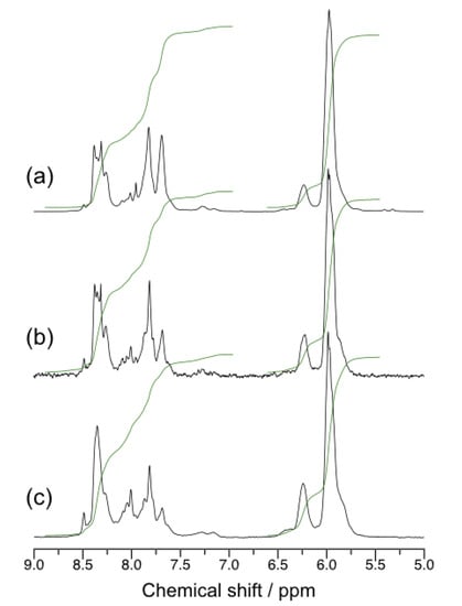 The structure of poly(tBuAH) obtained was characterized by elemental analysis and 1H NMR. As can be seen in Materials and Methods, the C, H, and N contents of polymers agreed well with those of tBuAH, indicating that the polymers were obtained by CuAAC and HC. It should be noted here that a poly(tBuAH) sample obtained by CuAAC polymerization contained a significant amount of inorganic salt, which may be derived from the copper catalyst utilized. Since the polymer sample was washed with an aqueous solution of EDTA, it is likely that poly(tBuAH) captures strongly copper ions [33]. Figure 1b,c exhibit 1H NMR spectra for the polymers obtained by CuAAC and HC, respectively. Figure 1b shows rather sharp signals assignable to the 1,2,3-triazole and methine protons at 8.4 and 6.0 ppm, respectively. This spectrum also contains signals due to the methylene protons at 2.5 and 2.1 ppm as well as a signal of t-butyl protons at 1.4 ppm. The ratio of area intensities agrees well with the polymer structure shown in Scheme 1b. These observations indicate that CuAAC polymerization of tBuAH yields poly(tBuAH) composed of 1,4-disubstituted 1,2,3-triazole units (1,4-units). On the other hand, the 1H NMR spectrum (Figure 1c) for the poly(tBuAH) obtained by HC polymerization exhibits more complicated signals ascribable to the triazole (7.6–8.4 ppm) and methine protons (5.8–6.4 ppm) because of 1,4- and 1,5-disubstituted 1,2,3-triazole units (1,4- and 1,5-units) (Scheme 1b). It should be noted here that the triazole and methine protons exhibit separate signals based on the triads and diads, respectively, as can be seen in Figure S9 in the Supplementary Materials. On the basis of the HSQC for poly(tBuAH) (run 6) (Figure S10 in the Supplementary Materials), the signals in the regions of 8.2–8.4 and 7.6–8.2 ppm are assignable to the 1,4- and 1,5-units, respectively. The HMBC data for poly(tBuAH) (run 6) confirmed that the signals at ca. 6.0 and 6.2 ppm were ascribable to the methine protons of 1,4/1,4-, 1,4/1,5-, 1,5/1,4-diads and 1,5/1,5-diad, respectively (Figure S11 in the Supplementary Materials) [42]. From the ratios of area intensities of triazole protons (Figure 2), the fractions of 1,4-unit (f1,4 (= x in Scheme 1)) were evaluated, as summarized in Table 1. The fraction, f1,4, decreases from 0.49 to 0.38 with increasing the permittivity of solvent used. This may be because the 1,5-disubstituted 1,2,3-triazole possesses a larger dipole moment than that of the 1,4-disubstituted 1,2,3-triazole (Figure S12 in the Supplementary Materials).