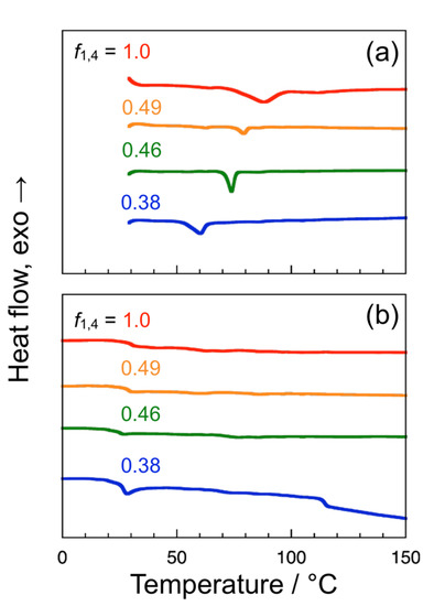 DSC data for the poly(tBuAH) samples of different f1,4 under a stream of nitrogen (200 mL min−1); the first (a) and second heating scans (b). The heating rate was set at 10 °C min−1.