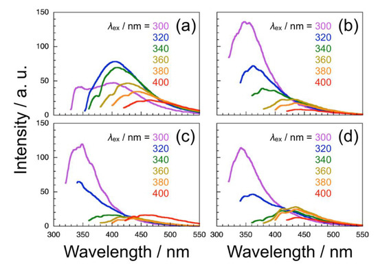 Steady-state fluorescence spectra for 1.0 g L−1 solutions of the poly(tBuAH) samples of different f1,4 in DMF obtained by excitation at varying wavelengths from 300 to 400 nm; f1,4 = 1.0 (a), 0.49 (b), 0.46 (c), and 0.38 (d).