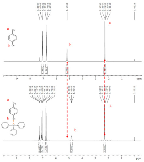 1H-NMR spectrum of (a) p-cresol, and (b) p-cresol/triphenylamine.
