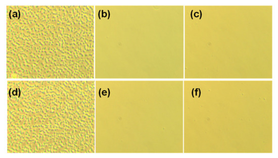 Optical microscope photos of PTPA-C6/PS blend (1:1) (a,d), PTPA-C6/PS-co-5PHS blend (1:1) (b,e), and PTPA-C6/PS-co-10PHS blend (1:1) (c,f) after spin-coating on glass and being annealed at 25 °C (a–c) and 100 °C (d–f).