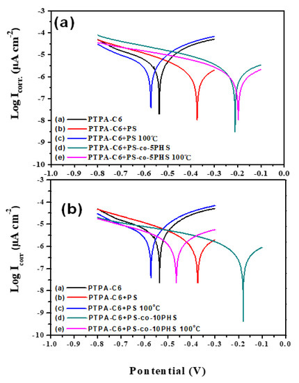 PTPA-C6 shows good anticorrosion properties from the electrochemical impedance spectroscopy (EIS) measurements [18]. These properties are further enhanced with the increased hydrophobicity and improved bonding to the iron substrate. The corrosion current is reduced with the blending of PTPA-C6 with PS-co-PHS copolymers (Figure 5). As listed in Table 2, the corrosion current of PTPA-C6 on iron is 2.89 µA·cm−2. It increases to 3.09 µA·cm−2 after blending with PS and further increases to 3.60 µA·cm−2 after thermally treated at 100 °C because of the incompatibility between PTPA-C6 and PS, which leads to phase separation. With the introduction of hydroxyl groups to the PS, not only is compatibility between PTPA-C6 and PS improved significantly, but the bonding strength between the polymer coating layer and iron substrate is as well. Corrosion current reduces to below 1 µA·cm−2 in both as-cast and annealed films and also gives rise to much higher protection efficiency (PE). PE values are all above 94% after thermal annealing at 100 °C for 1 h.