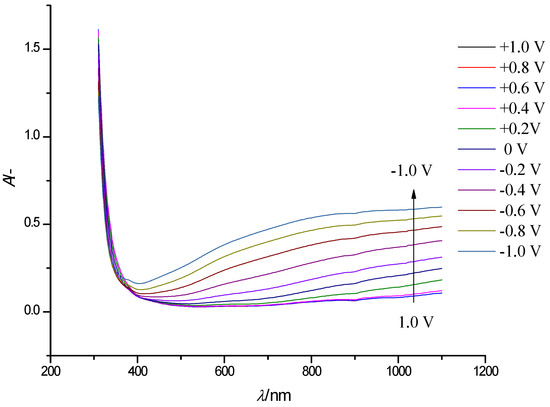 Figure 4 shows a similar series of steady-state electronic absorption spectra of a WO3 film. In the spectra recorded at potentials ranging from 1 V to −0.8 V, we can see the appearance of a broad absorption band in the vis-NIR range of the spectrum (850–1100 nm), which grows with a negative shift of electrode potential.