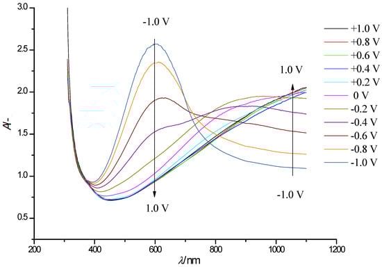 Electronic absorption spectra of a PEDOT/WO3 film on an FTO electrode at electrode potentials in the range −1.0 to + 1.0 V (step width 0.2 V, arrows show the direction of the absorption band change with increasing potential) in solution of 0.5 M LiClO4/PC.