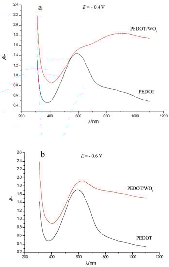 The comparison of electronic absorption spectra of PEDOT and PEDOT/WO3 films at two selected potentials (Figure 6) clearly shows the differences between the spectra of PEDOT and PEDOT/WO3.