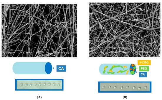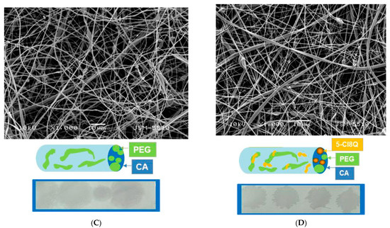 SEM images of the CA and CA,PEG fibrous mats, loaded with 5-Cl8Q, are presented in Figure 1B,D. The fiber diameters of these materials were 750 ± 120 and 446 ± 110 nm, respectively. It was found that the PEG addition reduced more significantly the fiber diameters than the addition of the model drug.