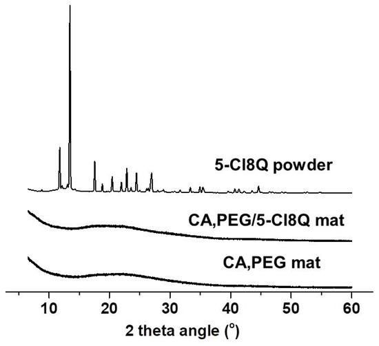 In the present study, the water contact angles of the obtained materials were measured. Neat CA fibrous mats were hydrophobic with a water contact angle of 120.8° ± 3.0°. The water droplets were spherical and they preserved their shape for 2 h (Figure 1A). The measured contact angle values of CA/5-Cl8Q mats were 119.0 ± 3.2° and were close to those measured for the CA fibrous mats. The incorporation of water-soluble polymer, PEG, resulted in a significant decrease in the measured contact angle value. The values of the water contact angle of CA, PEG, and CA,PEG/5-Cl8Q mats were 0°, thus indicating complete wetting (Figure 1C,D). We have assumed that the fiber surface is mainly composed of CA; however, there are small areas rich in PEG that favor wetting and that lead to a significant reduction in the water contact angle. The incorporation of PEG even in small amounts resulted in the hydrophilization of the obtained fibrous materials and had a significant effect on the value of the water contact angle, which was 0°. It is known that electrospun materials can be used for drug loading and the amorphization of crystalline active pharmaceutical ingredients. Moreover, the electrospun fibrous materials demonstrate a reduction in the overall dose needed for the therapeutic activity, by improving the dissolution and bioavailability of the drugs [24]. Therefore, it was of interest to determine the state of the incorporated drug in the CA and CA,PEG fibers. The crystallinities of the obtained fibrous mats and 5-Cl8Q (powder) were analyzed by X-ray diffraction analysis (Figure 2). In the XRD patterns of 5-Cl8Q (powder), characteristic diffraction peaks of the drug were observed. These sharp diffraction peaks showed that the neat drug was highly crystalline. In contrast, the XRD analysis revealed that CA and CA,PEG mats were amorphous. Interestingly, the presence of an amorphous halo was detected for CA,/5-Cl8Q and CA,PEG/5-Cl8Q fibers as well. This finding revealed that 5-Cl8Q was in the amorphous state when incorporated into the fibers by electrospinning. The amorphization of 5-Cl8Q could be explained with the extremely rapid drying of the jet during the electrospinning, which hampers molecular motion. This observation indicates that electrospinning is an effective technique for the one-step incorporation of drugs/biologically active substances in fibrous materials where they are to be found in the amorphous state.