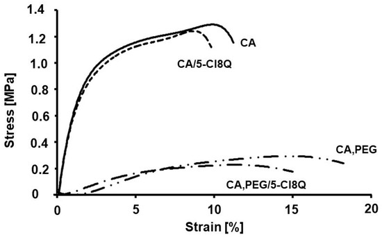 Stress–strain curves of CA, CA/5-Cl8Q, CA,PEG, and CA,PEG/5-Cl8Q mats.