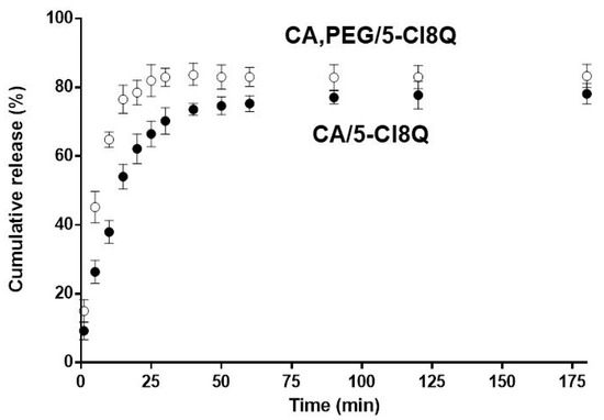 The drug release from the electrospun mats of CA/5-Cl8Q and CA,PEG/5-Cl8Q was determined spectrophotometrically. The obtained results are presented in Figure 4. Initially, burst release was detected. After that, a gradual release was followed. The CA/5-Cl8Q fibrous mat released the drug at a smaller rate compared to the CA,PEG/5-Cl8Q mat. The amounts of the released drug from CA/5-Cl8Q and CA,PEG/5-Cl8Q were 78 ± 3.38% and 86 ± 3.02%, respectively (for 175 min). These differences in the release rate may be due to the different wettability of the fibers. The measured water contact angles for the CA/5-Cl8Q and CA,PEG/5-Cl8Q fibrous materials were 120° and 0°, respectively. The incorporated water-soluble polymer favors the penetration of the aqueous medium in the fibrous material and brings about the rapid drug release. It was found that the bioactive compound release was facilitated by PEG.