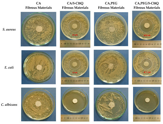 In the present study, the antibacterial and antimycotic activities of the electrospun mats were assessed by performing tests against Gram-positive bacteria S. aureus, Gram-negative bacteria E. coli, and fungus C. albicans. The results obtained by the determination of the zones of inhibition after 24 h of contact of the fibrous materials with the bacterial or fungal cells are shown in Figure 5. As expected, CA and CA,PEG mats did not exhibit any antibacterial and antifungal activities. Well-distinguished zones of inhibition of the bacterial and fungi cells growth were detected for the drug-containing fibrous materials. The diameters of the zones of inhibition of CA/5-Cl8Q and CA,PEG/5-Cl8Q mats were 4.0 ± 0.18 and 4.5 ± 0.2 cm against S. aureus and 4.0 ± 0.15 and 4.1 ± 0.22 cm against E. coli, respectively. The incorporation of 5-Cl8Q in the mats that were placed in contact with C. albicans resulted in the complete inhibition of the fungi growth. In contrast, the neat CA and CA,PEG mats did not alter the fungi growth and did not exhibit any antifungal activity. However, the incorporation of PEG resulted in the release to a higher rate of the biologically active substance, leading to the observation of wide zones of inhibition around the discs. The observation of zones of inhibition around all mats containing 5-Cl8Q is evidence that the incorporated drug imparts antibacterial and antifungal activities to the prepared novel fibrous materials.