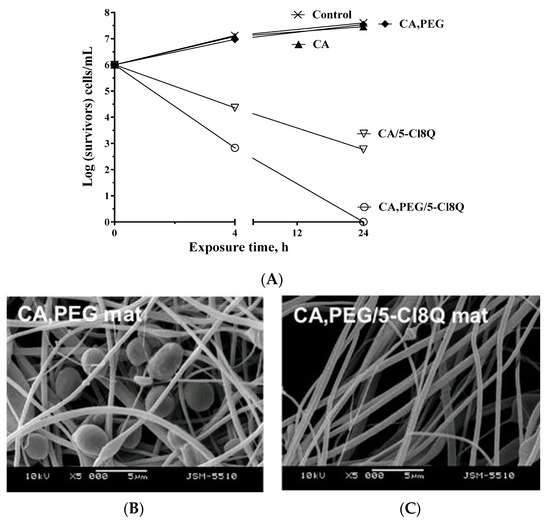 Moreover, the fibrous mats of neat CA and CA,PEG did not affect the fungal growth, and after 24 h of contact, the number of cells reached 7 log. As seen from Figure 6A, a decrease in the number of the viable fungal cells was detected for the exposure time of 4 h for the fibrous materials containing 5-Cl8Q. The mats containing the model drug exhibited antifungal activity and, after 24 h of contact, a reduction in cell number was observed. Moreover, the CA,PEG/5-Cl8Q fibrous mats killed all C. albicans fungal cells at the 24th hour. This may be attributed to the PEG ingredient in the CA,PEG/5-Cl8Q materials that facilitates the release of the model drug and assists in manifesting its antifungal activity. On the other hand, the 5-Cl8Q incorporated into the hydrophobic CA mats released slowly. For CA/5-Cl8Q fibrous mats, a decrease in C. albicans titer by 3 log units was attained. It could be concluded that the polymers do not possess any intrinsic antibacterial activity. However, the incorporation of 5-Cl8Q imparted to the obtained materials significant antibacterial and antifungal efficiency.