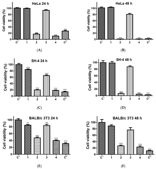 Cell viability of HeLa (A,B), SH-4 (C,D) and BALB/c 3T3 (E,F) cells tested by MTT method after (A,C,E) 24 h and (B,D,F) 48 h of incubation with different formulations: C1—untreated cells; 1—CA mat; 2—CA/5-Cl8Q mat; 3—CA,PEG mat; 4—CA,PEG/5-Cl8Q mat; C2—free 5-Cl8Q (100 µM/L); data are expressed as mean ± SD percent of viable cells and are representative of 5 experiments. ** p < 0.01, *** p < 0.001.