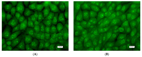 HeLa cells, SH-4 cells, or mouse BALB/c 3T3 fibroblasts (1 × 105 cells/well) were plated on glass lamellas, placed on the bottom of 24-well plates, at a concentration of 2 × 105 cells mL−1, and incubated at 37 °C for 24 h in a CO2 incubator to form a monolayer. After that, the samples were placed in 24-well plates for a further 24 h of incubation. Then, the mats were removed, and glass lamellas were washed twice with phosphate-buffered saline (PBS, pH 7.4) to remove unattached cells, they were stained with AO and EtBr in the ratio of 1:1 (10 μg/mL), and they were then immediately examined with a fluorescence microscope (Leika DM 5000B, Wetzlar, Germany) within 30 min, before the fluorescence had started to fade away.