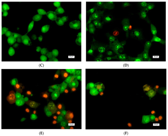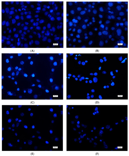 Apoptosis is a form of programmed cell death that occurs in multicellular organisms. Biochemical events lead to characteristic cell morphology changes and death. These changes include: blebbing, cell shrinkage, nuclear fragmentation, chromatin condensation, chromosomal DNA fragmentation, and global mRNA decay [31]. The morphological changes in apoptotic cells are clearly distinguishable at the light microscopic level. In order to identify the morphological changes in damaged tumor cells, the method of intravital double staining with fluorescent dyes (AO and EtBr) and DAPI was applied. For that purpose, HeLa cells were cultured for 24 h on CA, CA/5-Cl8Q, CA,PEG, and CA,PEG/5-Cl8Q materials, and they were stained using fluorescent dyes (AO and EtBr) (Figure 8). Untreated HeLa cells are characterized by a normal morphological structure with pale green nuclei and bright yellow-green nucleoli. The cells that were in contact with CA and CA,PEG mats had normal morphologies, as well. The number of HeLa cells that were in contact with CA,PEG was detected to be reduced (Figure 8C) in comparison with the cells of untreated cells and the cells cultured on the CA mat (Figure 8A,B). This can be explained by the fact that PEG exhibits cytostatic effects [32], but it is not cytotoxic [33]. As seen from Figure 9C, PEG did not have any negative effect on the cell growth and no dead cells were observed. In contrast to them, the contact with the fibrous mats containing 5Cl8Q resulted in a decrease in the number of HeLa cells and in the occurrence of morphological changes. Pale green and orange-red colored dead cells, the majority of which have the morphological characteristics of early or late apoptosis, were observed. The observed morphological changes included: cell rounding-up, cell shrinkage, condensation and aggregation of chromatin, and DNA fragmentation and formation of apoptotic bodies. A strong cytotoxic effect was observed in CA/5-Cl8Q and CA,PEG/5-Cl8Q mats (Figure 8D,F). A significant number of cells’ nuclei and cytoplasm were stained in orange-red.