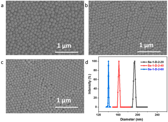 Then, a diselenide group was introduced into polymer particles by using FVPDSe as the crosslinker in soap-free emulsion polymerization of DSe-PS in an aqueous medium at 75 °C. The polymerizations were carried out by using different amounts of crosslinker. Two crosslinker, e.g., FVPDSe and DVB, were used in preparing polymer particles for the consideration of possible fragmentation of diselenide in FVPDSe after oxidization. The results are summarized in Table 1. It shows that polymer particles could be adjusted by varying the concentration of crosslinker and the amount of water. Polymeric particles with a dimeter of 141–190 nm could be obtained in these conditions. The morphology of the obtained particles was characterized by SEM, as shown in Figure 2a–c. The results showed that regular spherical particles were obtained after polymerization. The particle size almost showed monodispersity, as identified by DLS analysis (Figure 2d).