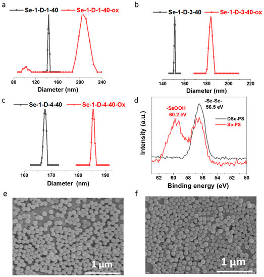 Particle size distribution curve of DSe-PS before and after oxidation by H2O2 (black-before oxidation; red-after oxidation). (a) Se-1-D-1-40, (b) Se-1-D-3-40, (c) Se-1-D-4-40. (d) XPS spectra of Se in DSe-PS and Se-PS which was oxidized by 5 wt% H2O2 overnight. SEM images of Se-1-D-3-40 (e) before and (f) after oxidation.