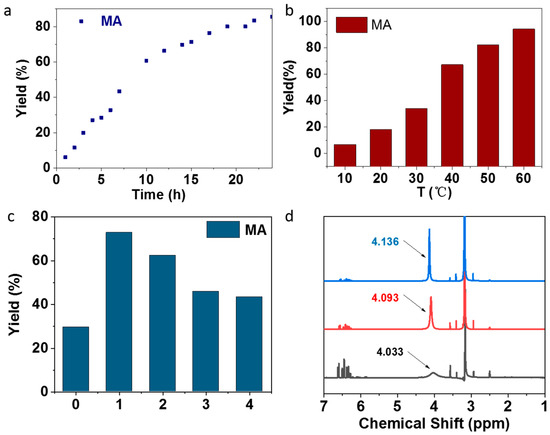 With these initial results, the reaction was investigated in detail. Firstly, the kinetic of reaction was investigated by using oxidized Se-1-D-5-40 as the catalyst at 50 °C. The results are summarized in Figure 4a. The reaction was carried out smoothly and reached over 80% yield of MA after 24 h. Secondly, the effect of reaction temperature on the yields of MA was investigated. The results are summarized in Figure 4b. They showed that the yield of MA was increased with the increasing of temperature. The highest yield of MA was obtained as 94% at 60 °C. Thirdly, the effect of selenium concentration in PS particles on the reaction was investigated. The results are shown in Figure 4c. The maximum yield of MA was 73% in the case of catalyzing by DSe-PS prepared with a weight ratio of FVPDSe and DVB of 1:1. Decreasing the selenium content in DSe-PS resulted in decreasing yields of MA from 73% to 45%. It should be noted here that only MA was obtained in the oxidation of acrolein catalyzed by DSe-PS. We speculated that the hydrogen bond between the fluorine atoms contained in the microspheres and the active hydrogen in methanol promote the rapid esterification of acrylic acid which offered the highly selective formation of MA. In order to verify this hypothesis, the interaction between pentafluorophenyl seleninic acid and methanol was monitored by 1H NMR. The results are shown in Figure 4d. They indicated that the chemical shift of protons in methanol was shifted from the original position after cooperation with pentafluorophenyl seleninic acid, which proved the existence of the hydrogen bond. In the case of mixing 0.01 g pentafluorophenyl seleninic acid with 0.01 mL methanol, the signal transformed from a sharp peak to a broad peak due to the formation and fast exchanging of hydrogen bonds.