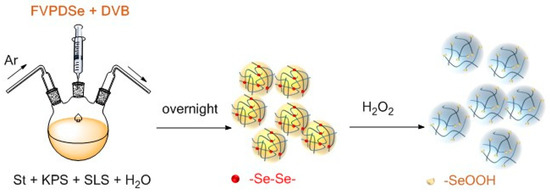 Selenium-containing polystyrene (DSe-PS) microspheres were synthesized by soap-free emulsion polymerization. The DSe-PS can be oxidized by H2O2, making the diselenide bond into seleninic acid.