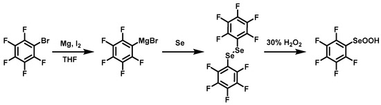 1,2-Bis(perfluorophenyl)diselane was synthesized according to the literature [30] with optimized conditions (Scheme 3). Magnesium chips (0.30 g, 12.5 mmol) and a pill of I2 were mixed in 16 mL of tetrahydrofuran (THF). Bromopentafluorobenzene (2 g, 8.1 mmol) was added dropwise followed by vigorous stirring for one hour. Finally, selenium powder (0.70 g, 8.8 mmol) was added and stirred vigorously for another hour. Excess magnesium chips were quenched with dilute hydrochloric acid. The product 1,2-bis(perfluorophenyl)diselane was obtained by flash column chromatography with petroleum ether. Pentafluorophenyl seleninic acid was obtained by oxidizing 1,2-bis(perfluorophenyl)diselane with H2O2 (30%) in dichloromethane.