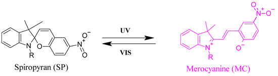 - Klajn, R. Spiropyran-Based Dynamic Materials. Chem. Soc. Rev. 2014, 43, 148–184. [Google Scholar] [CrossRef]