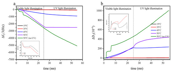 By way of example, we selected different temperatures for isothermal treatment with and without illumination below and above the LCST when investigating with QCM-D. Figure 5a shows the effect of switching from visible to UV light irradiation on Δf3/3 as a function of time at 19 °C, 35 °C, 45 °C, 50 °C; and 50 °C when the sensor was not irradiated with UV light, respectively. At 19 °C and 35 °C, the introduction of the copolymeric solution inside the window cell causes an initial frequency decrease (mass increase) followed by a slower frequency decrease as the system saturates at −31 Hz and −40 Hz, respectively. Starting at 25 min, the sensor surface was irradiated with UV light, what caused a marginal increase in Δf3/3 of a few Hz, followed by a linear decrease in the frequency in the next several minutes, see inset of Figure 5a. In comparison, when there is no light switch at 19 °C, Δf3/3 and ΔD3 signals do not show any significative change, see supporting information (Figure S5a,c). The spike of Δf3/3 occurring immediately after illumination attributed to the effect of UV light on the crystal as described in the Materials and Methods section. The shallow linear decrease in the frequency shift is probably due to an increase in acoustic thickness as the copolymer chains swell. A similar result was observed in a previous study [56], where PNIPAAm-co-SPA thin films were illuminated with a UV lamp at 19 °C. In this material, the behavior was explained by a photoinduced hydration due to the photoisomerization of the rather hydrophobic spiropyran into the distinctly more hydrophilic merocyanine when the thermo-responsive part of the copolymer is sufficiently hydrophilic.