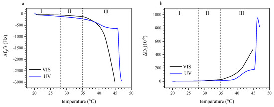 The dissipation data corresponding to the observed cases of Δf3/3 is displayed in Figure 6b. Here, too, we distinguish the three regions of (I) T < 28 °C, (II) 28 °C < T < 35 °C, and (III) T > 35 °C (marked as I–III in Figure 6). Again, an increase in dissipation correlates to the enhancement of coupling between water molecules and polymer chains due to the photo-induced hydration under UV illumination (region I). Moreover, there is a significant difference of the sensed masses on the sensor, depending on the type of irradiation. In the temperature range of 21 °C to 28 °C, ΔD3 increases by a factor of about two, that is, from 1.6 × 10−6 to 3.3 × 10−6 and from 2.2 × 10−6 to 4.9 × 10−6 for the visible and UV irradiated film, respectively. In the temperature range of 28 °C to 35 °C, ΔD3 increases more strongly for the solution exposed to visible light as compared to the one irradiated with UV light. This observation corroborates our interpretation that the competition between dehydration and adsorption starts already several K below the commonly reported LCST. At 35 °C, ΔD3 increases dramatically, in agreement with the resonance frequency data. According to the change of slope at ~38 °C, the dehydration happens gradually also under UV light. In this case, the retarded phase transition reflects in the over damping of the layer happening at ~46 °C, where the magnitude of ΔD3 reaches 953 × 10−6.