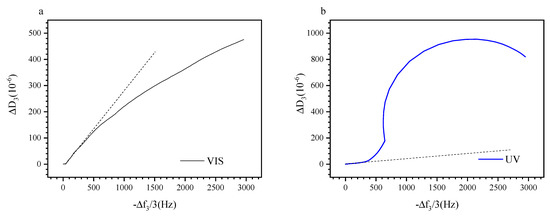 Examining the change of the energy dissipation as function of the negative frequency shift allows to eliminate the temperature as a variable and to focus on the effect of the light irradiation on the viscoelastic properties during layer build-up [79]. Figure 7a,b show the evolution of ΔD3 as function of −Δf3/3, respectively, for visible and UV irradiated P (TEGA-co-SPA) at the silica–water interface. Interestingly, both properties are not directly proportional; furthermore, the adsorbed film does not evolve in the same way whether it is irradiated with visible or UV light. Under Vis illumination, the change in dissipation underrepresents the change in resonance frequency whereas under UV light, it strongly exceeds the frequency change. A linear correlation between both properties is found only in the onset region of film formation, i.e., within 0 to 550 Hz (Vis) and 0–320 Hz (UV), where surface coverage of the layer is still low. In this range, the hydrodynamic thickness is expected to be small, and the number of polymer molecules adsorbed physically through trains, loops, and tails is negligible [80]. For as long as the dissipation values are low and ΔD3 increases linearly with −Δf3/3, we assume that the viscoelastic properties of the film remain unchanged and the parameter variations are solely due to continuous adsorption. The occurrence of such a region was similarly observed by QCM-D for different adsorbing systems, including polyelectrolytes [81] and homopolymers on gold [52].