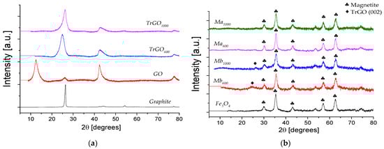 X-ray diffraction patterns of: (a) graphite, GO, TrGO600, and TrGO1000 and (b) Fe3O4, Mb600, Mb1000, Ma600, and Ma1000.