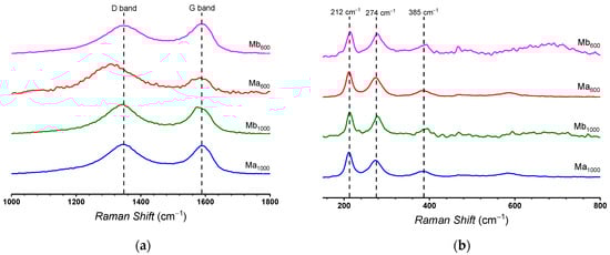 Figure 2a,b shows the Raman spectra of nanomaterials of Mb600, Mb1000, Ma600, and Ma1000. As expected, D and G bands characteristic of graphene materials are seen (Figure 2a). These bands appear at ca. 1350 cm−1 and 1580 cm−1, respectively [,]. It is seen that the sample corresponding to Ma1000 presents a Raman redshift, which is associated with the interaction of graphene layers with nanoparticles []. This suggests the occurrence of interaction between the Fe-based structure and the graphene oxygen moieties, favoring the nucleation structure on the graphene structure. On the other hand, Figure 2b shows the region of the Raman spectra between 150 cm−1 and 1000 cm−1, presented to study the contribution of magnetite absorption bands. Bands are seen at ca. 212 cm−1, 274 cm−1, and 385 cm−1 [].