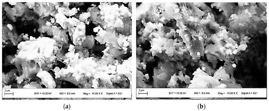 On the other hand, in Figure 6b, the data of Young’s modulus of PLA with filling of Mb600 and Ma600 with the Halpin Tsai model are shown as a function of the filler content. It is possible to observe that the theoretical data do not fit with the experimental results when α = 1 is used. This suggests that the adhesion of the PLA with nanofiller is low. Consequently, the experimental Young moduli of nanocomposite are lower than the expected values [].