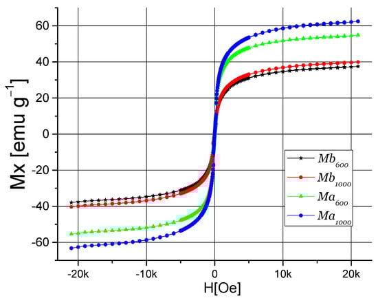 Figure 4 shows the cycles of magnetic hysteresis curves of TrGO:Fe3O4 nanomaterials, where the superparamagnetic behavior of these samples is seen. Nanomaterials Mb600 and Mb1000 presented magnetic saturation (Ms) of 37.5 and 39.9 emu·g−1, and coercivity (Hc) of 0.373 Oe and 0.023 Oe, respectively. On the other hand, nanomaterials Ma600 and Ma1000 presented Ms values of 55.2 and 63.01 emu·g−1, respectively, and the Hc were 8.509 and 4.219 Oe, respectively. The tendency to increase Ms and coercivity Hc, which can be attributed to the higher Fe amount used to synthesize the Ma600 and Ma1000 nanomaterials. This can be inferred from the results of X-ray diffraction analysis and Raman spectroscopy. TrGO600-based nanomaterials have lower magnetic susceptibility but greater coercivity compared to TrGO1000-based nanomaterials. These results suggest that the coercivity and magnetic susceptibility depend on the crystal size of Fe3O4.
