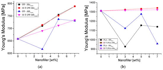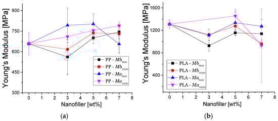 Young’s modulus of nanocomposites: (a) PP-TrGO:Fe3O4; (b) PLA-TrGO:Fe3O4.