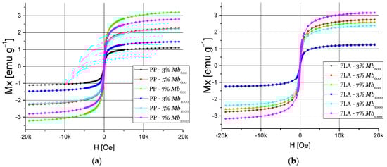 Figure 7 shows the magnetic hysteresis cycles of PP and PLA nanocomposites with nanomaterials of Mb600 and Mb1000 as a filler with a content of 3, 5, and 7 wt.%. In the case of PP nanocomposites (Figure 7a), it was found Ms value of 3.21 emu·g−1 and a Hc of 0.24 Oe using Mb600 with 7 wt.% filler. These data agree with the mechanical properties found for this nanocomposite with 7 wt.% filler of where Mb600 presents a decrease of these properties due to the agglomerations of the nanomaterials, favoring the contact between the nanoparticles, allowing that a higher magnetic saturation can be achieved in the nanocomposite.