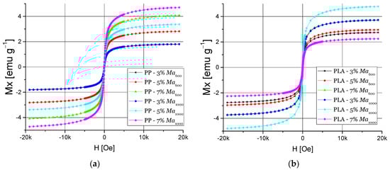 Figure 8 shows magnetic hysteresis cycles of PP and PLA nanocomposites with nanomaterials Ma600 and Ma1000 filler. PP nanocomposite magnetic properties showed a high Ms of 4.71 emu·g−1 using Ma1000 at 7% filler content and a high Hc of 5.35 using Ma600 at 7% filler (Figure 8a). Ma1000 presents a greater magnetic susceptibility than Ma600, so the PP nanocomposites based on this nanomaterial presented a higher magnetic susceptibility, and the contact between the nanoparticles with the polymer matrix likely favors the increase of Ms. In the case of PLA nanocomposites, they present a similar behavior as PP nanocomposites, while when using a 7 wt.% filler of Ma1000 a Ms of 4.8 emu·g−1 and a high Hc of 3.97 Oe using 5 wt.% Ma1000 as a filler (Figure 8b). Compared to PP nanocomposites, a difference in magnetic properties is seen due to interactions between the PLA matrix and the magnetite nuclei of the nanomaterials.