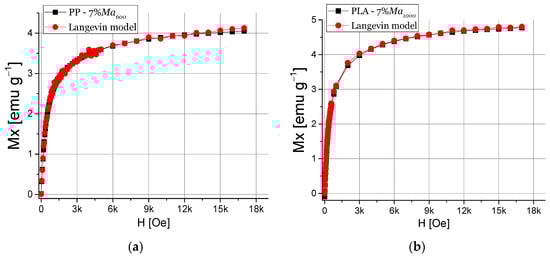 Figure 9 shows results of Langevin model for the nanocomposite, where is observed that the PP-7% Ma600 nanocomposites curve (Figure 9a) fits with the Langevin model and the estimated particle size is 68 nm and a magnetic moment of 2747 µb. On the other hand, it is observed that the experimental curve of the nanocomposite based on 7% Ma1000 also adjusts with the Langevin model. The calculated magnetic moment is 3113 µb and the particle size is 72 nm. It is possible to note that in both cases of PLA nanocomposites presents higher magnetic saturation than those of PP-based nanocomposites, which indicates a higher magnetic moment []. On the other hand, there is a correlation of particle size obtained in this theoretical approach with the results presented in the XRD section.