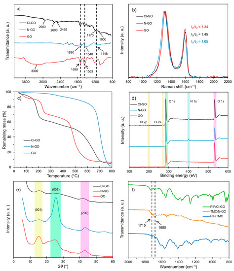 Thermogram curves of the synthesized materials are presented in Figure 1c. Three major weight losses can be observed for pristine GO. Weight losses at lower temperatures are associated with labile functional groups such as carboxylic acids, so a high degree of functionalization of GO (30%) was obtained. For N-GO, these drops were significantly reduced due to functional group displacement. A drop at 350 °C was present for N-GO instead of at 240 °C for pristine GO, suggesting the successful introduction of more stable functional groups in the GO structure. The increase in thermal stability of N-GO could be related to the presence of amino-carbons and to a partial reduction of GO, as reported by Irani et al. [43]. Cl-GO exhibited a mass drop of 40% at 170–200 °C, which may correspond to acyl chloride groups. This shift to lower temperature may be attributed to the presence of highly labile functional groups in Cl-GO. In accordance with these results, the proposed order for thermal stability of functional groups is NH2 > COOH > COCl.