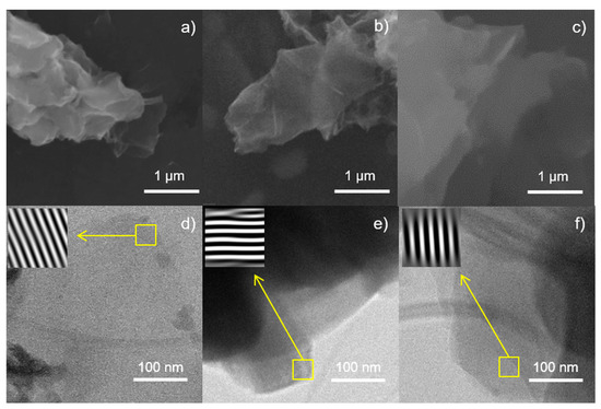 Morphological characterization of synthesized GO. SEM imaging of (a) GO, (b) N-GO, and (c) Cl-GO. TEM bright field imaging of (d) GO, (e) N-GO, and (f) Cl-GO. Inset: magnification of GO layers obtained by FFT processing.